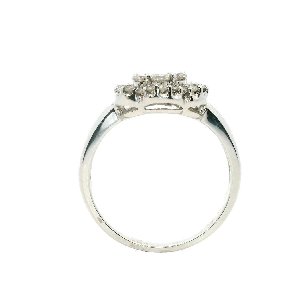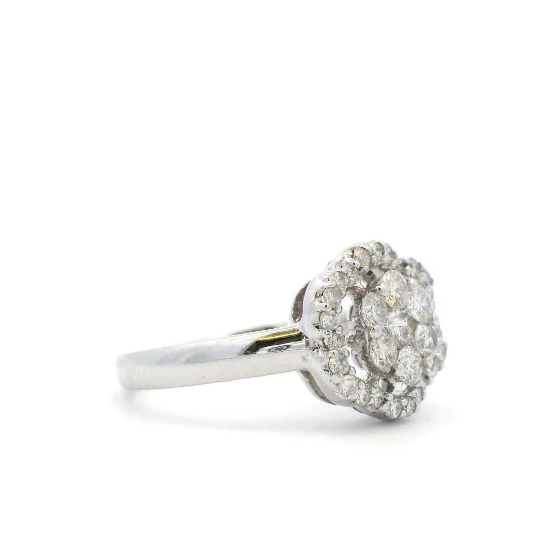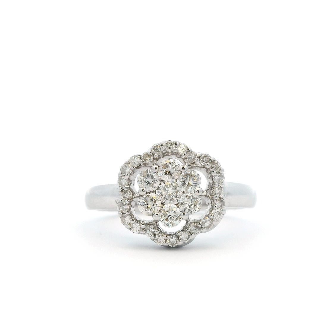 Crafted in 18KT white gold, this floral-inspired ring showcases seven prong-set round brilliant-cut diamonds totaling 0.44ct and twenty-four additional round diamonds weighing 0.20ct. The diamonds are graded G-I in color and VS-2 to SI-1 in clarity, enhancing the intricate floral motif with radiant sparkle.