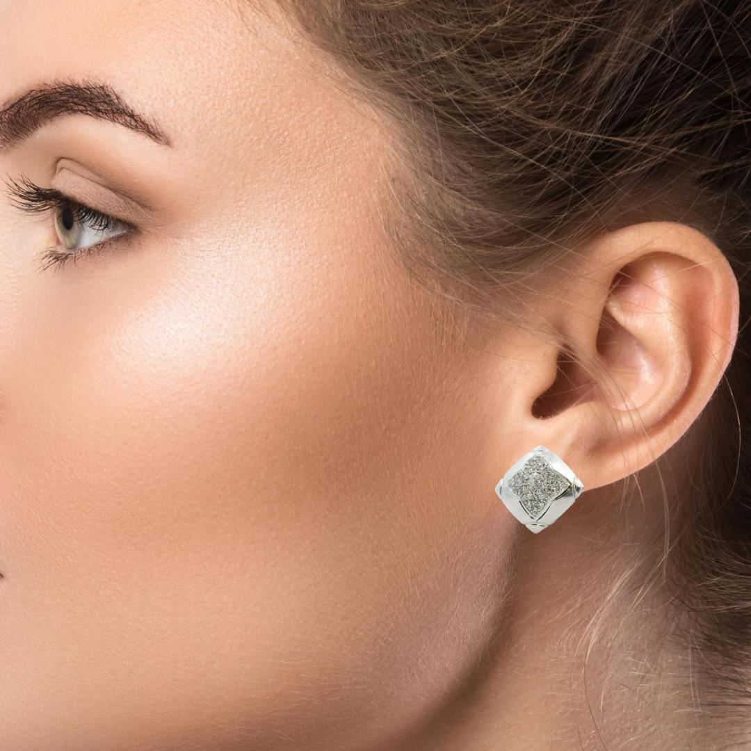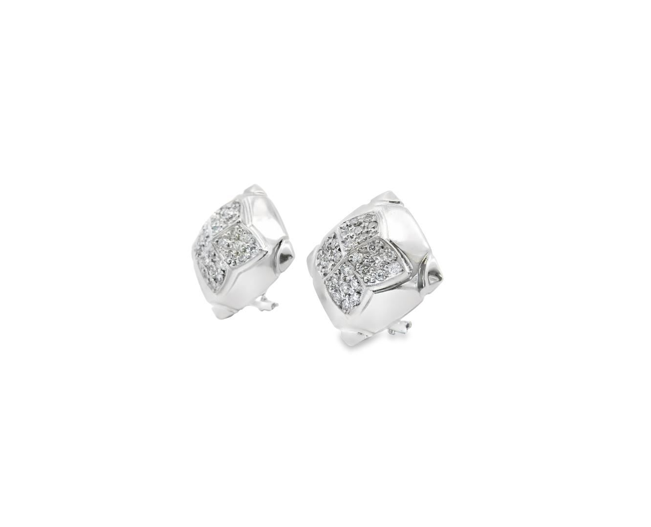 This pair of 18KT white gold square halo earrings features a classic Omega clip-back design. The earrings are set with fifty-six bead-set round brilliant cut diamonds totaling 0.65ct, with G-I color, SI-1 to SI-2 clarity, and a very good cut. The total weight of the earrings is 16.60 grams.