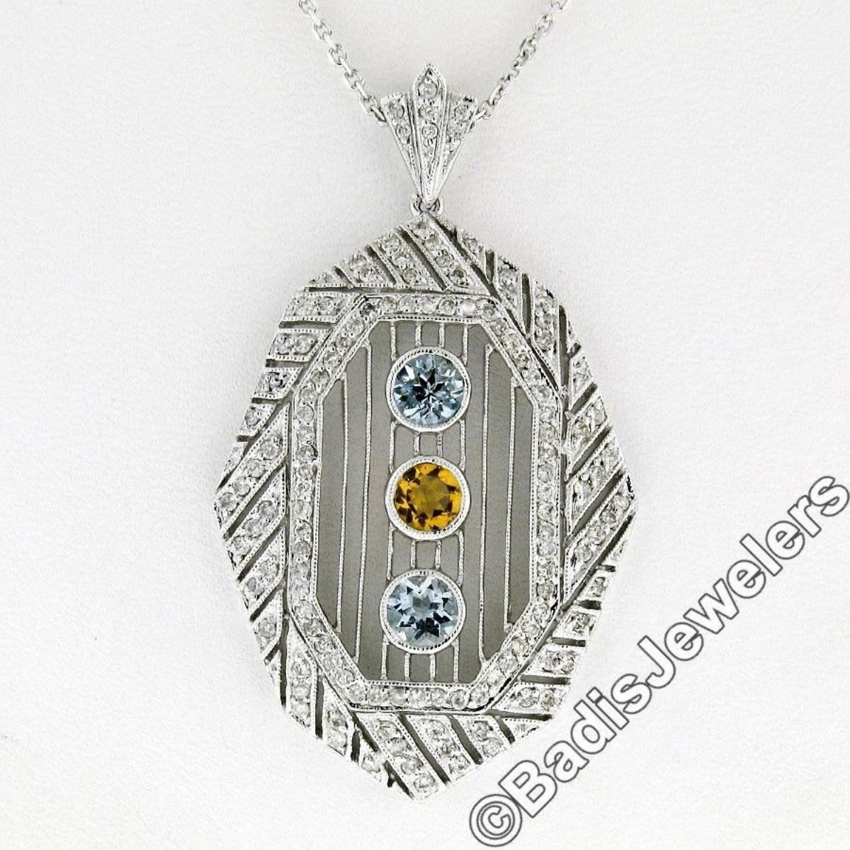 An 18kt white gold open work milgrain accented pendant featuring a center round cut citrine (0.25ct) flanked by a pair of round cut aquamarines (0.80ctw) surrounded by pave set round brilliant diamonds (G/H - VS1/VS2; 1.10ctw). 17 inch cable link chain, 13.42 grams total weight, pendant measures 53.3x30.6mm.