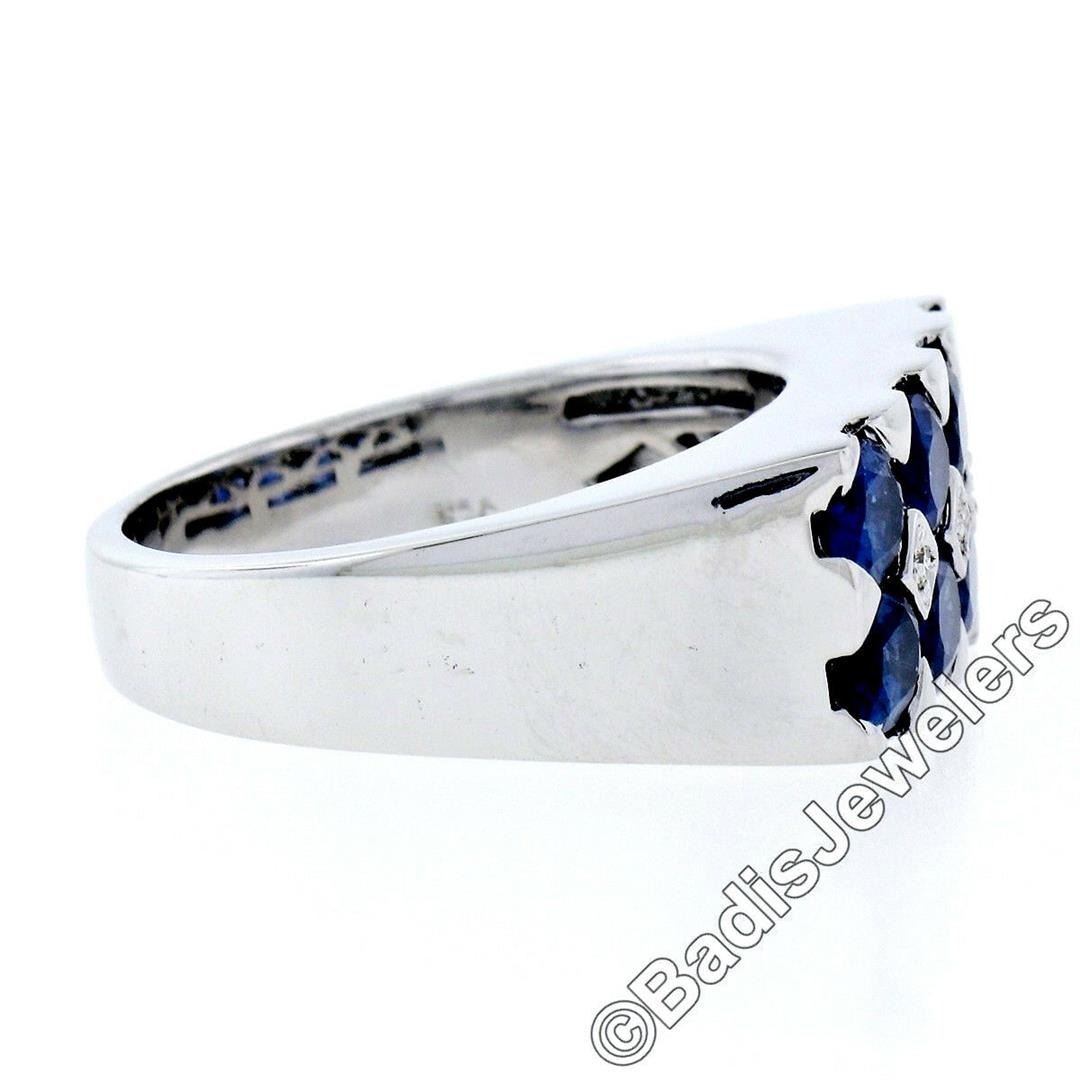 An 18kt white gold band ring featuring 8 oval cut blue sapphires (4.00ctw) bar set in 2 rows and accented by 3 bead set round brilliant diamonds (G - VS2; 0.03ctw). The ring is size 8, weighs a total of 12.22 grams, and measures 9.15mm wide.