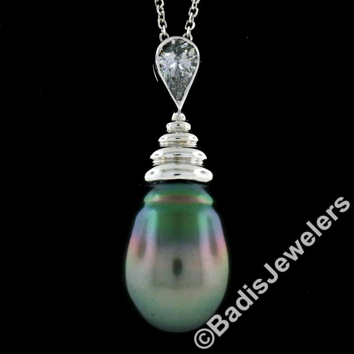 An 18kt white gold dangle pendant featuring a teardrop shaped cultured Tahitian pearl and a 0.60ct pear cut diamond (G - I1) hanging on a 14kt white gold chain. 18 inch beveled cable link chain, 7.60 grams total weight, pendant measures 32.46x12.65mm.