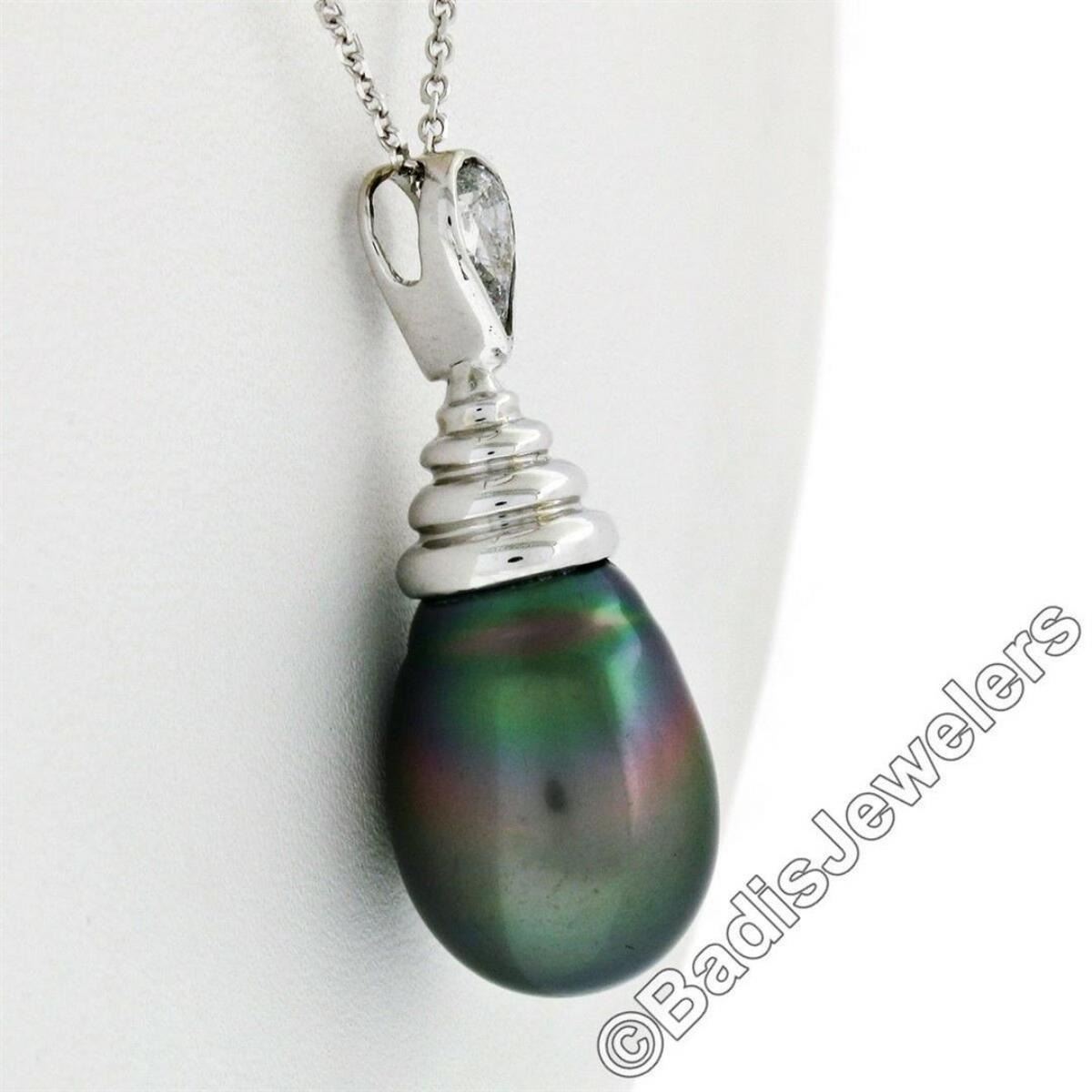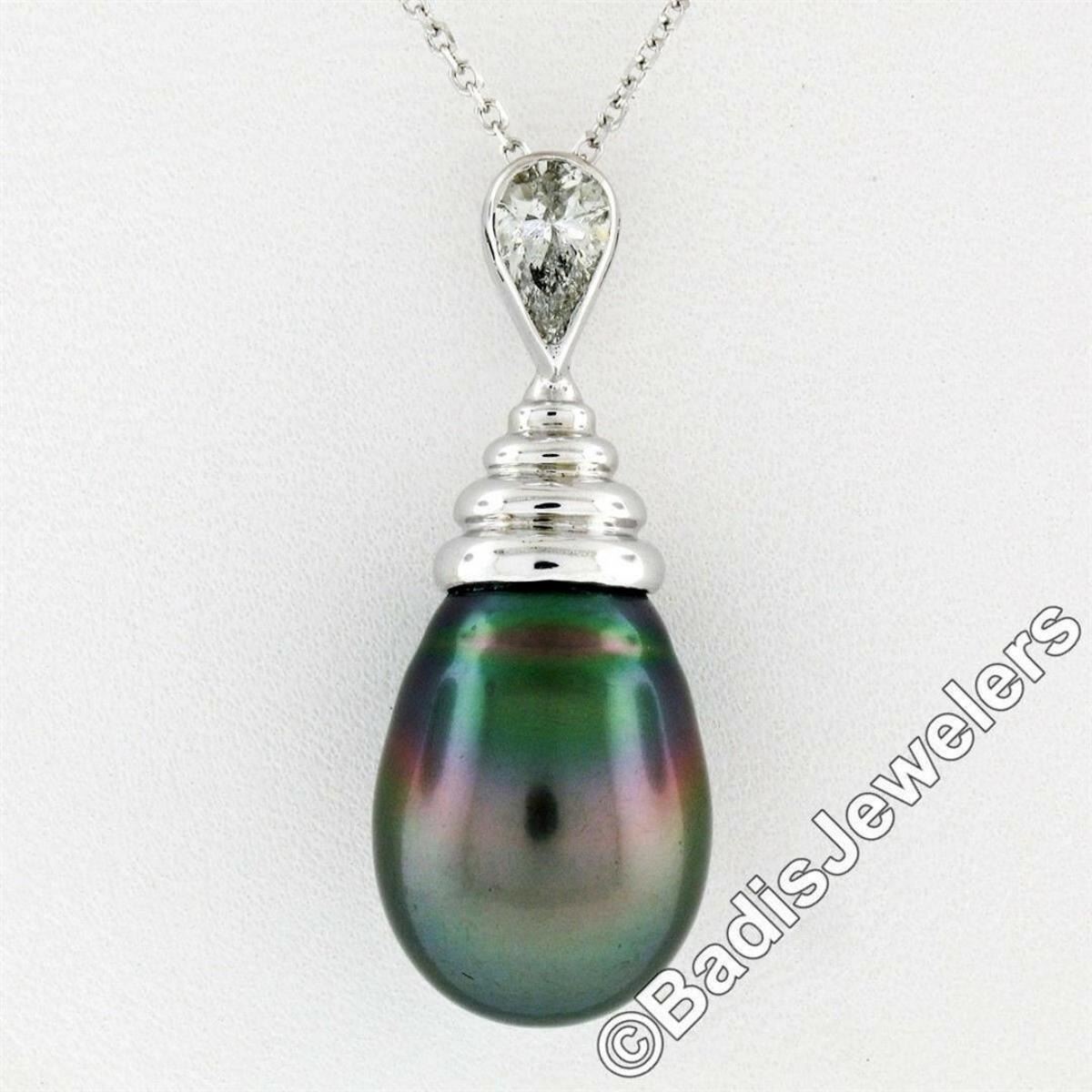 An 18kt white gold dangle pendant featuring a teardrop shaped cultured Tahitian pearl and a 0.60 ct pear cut diamond (G - I1) hanging on a 14kt white gold chain. 18 inch beveled cable link chain, 7.60 grams total weight, pendant measures 32.46x12.65mm.