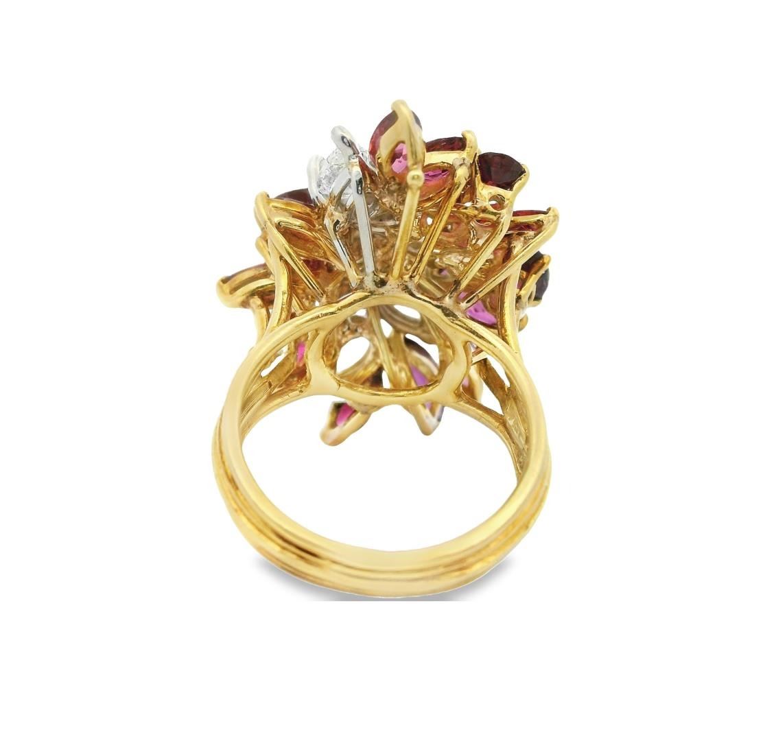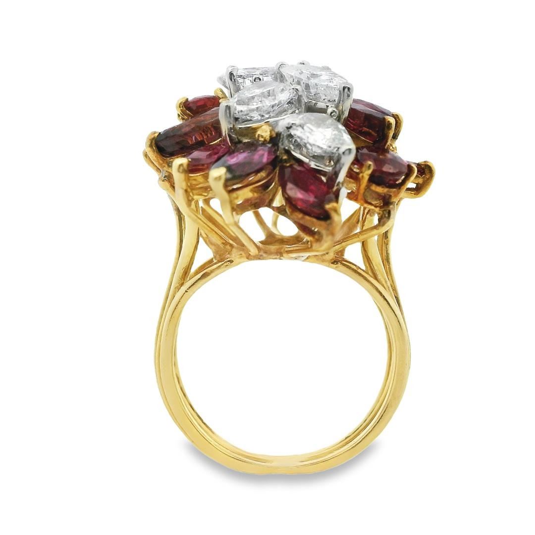 This handmade 18KT yellow gold fashion ring features a striking waterfall cluster design with a wire shank and basket motif. It showcases six pear-shaped diamonds totaling 3.26ct, alongside eleven marquise-cut rubies totaling 3.80ct and five oval-cut rubies totaling 1.65ct. The diamonds are G-H color, SI-2 to I-1 clarity, while the rubies are medium dark purplish-red with very good cuts. The ring weighs 11.60 grams.