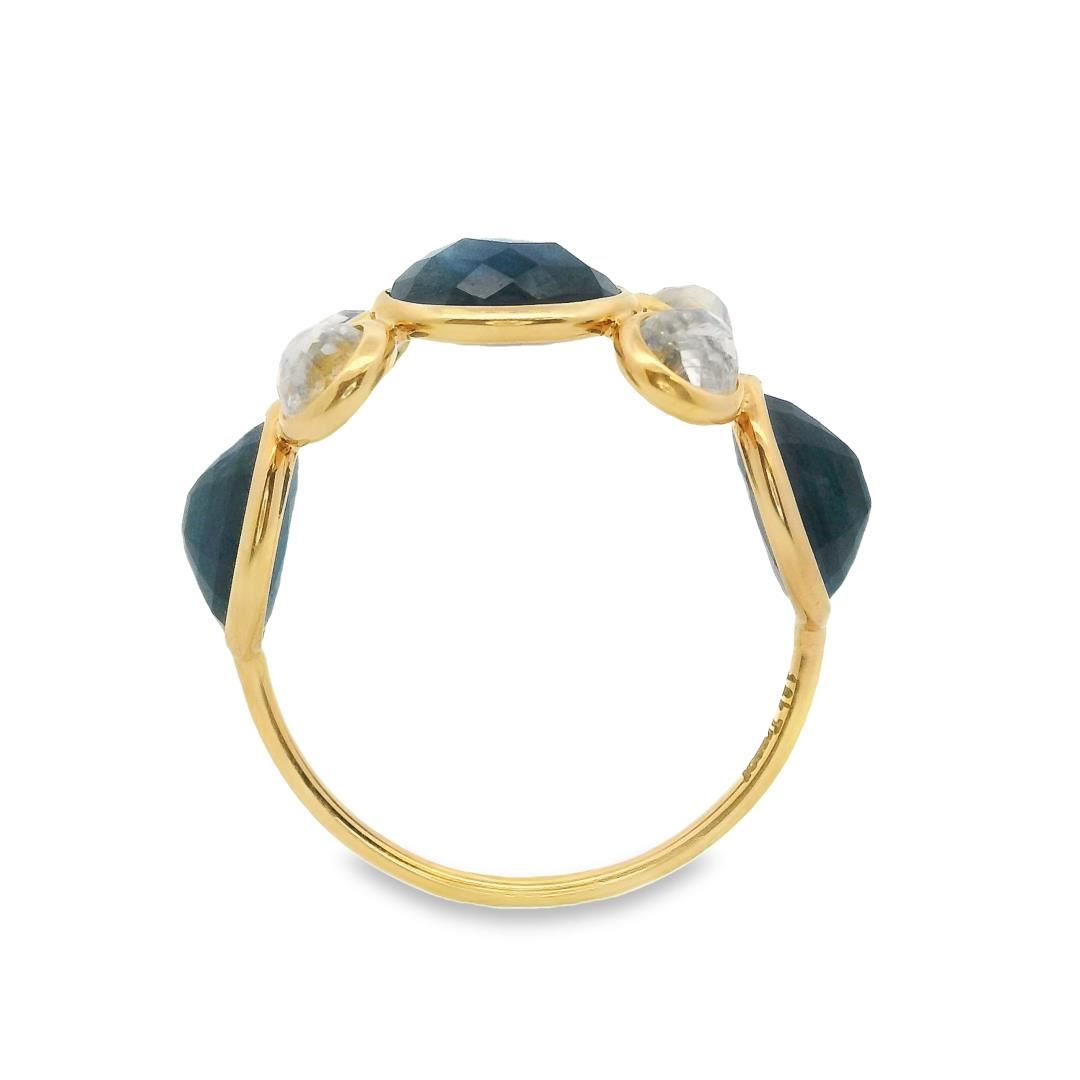 This striking 18kt yellow gold designer ring blends rich color contrasts with elegant craftsmanship. Featuring three bezel-set oval modified brilliant-cut natural blue sapphires, totaling 2.20ct, these gemstones exhibit a dark, moderately strong blue hue with a very good cut. Complementing them are four bezel-set round modified brilliant-cut natural moonstones, totaling 1.00ct, with a medium light, bluish-green glow and eye-clean clarity. The hand-assembled construction, bright polish finish, and slim 1.10mm shank enhance the ring's sophisticated aesthetic, making it a distinctive addition to any collection.
