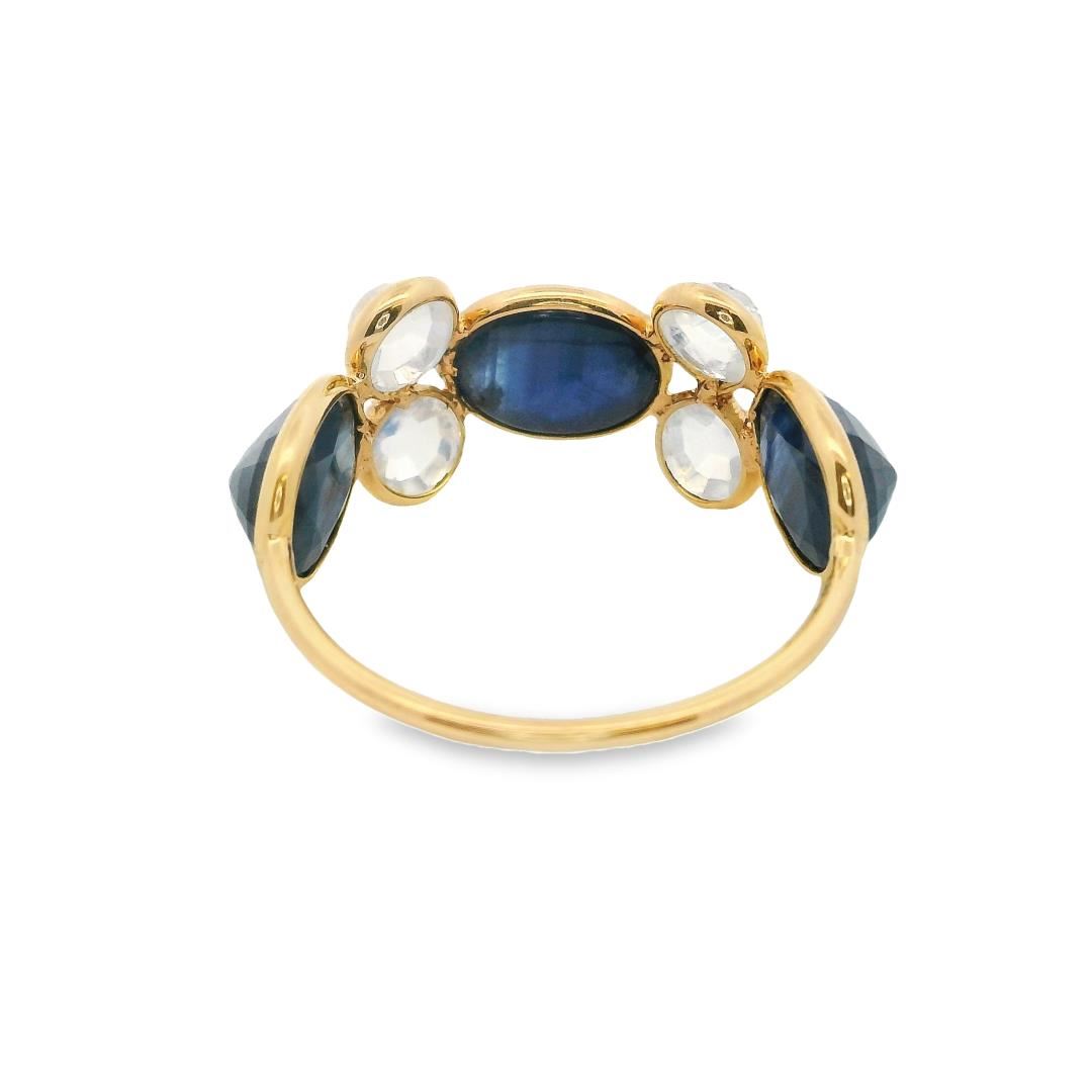 This striking 18kt yellow gold designer ring blends rich color contrasts with elegant craftsmanship. Featuring three bezel-set oval modified brilliant-cut natural blue sapphires, totaling 2.20ct, these gemstones exhibit a dark, moderately strong blue hue with a very good cut. Complementing them are four bezel-set round modified brilliant-cut natural moonstones, totaling 1.00ct, with a medium light, bluish-green glow and eye-clean clarity. The hand-assembled construction, bright polish finish, and slim 1.10mm shank enhance the ring's sophisticated aesthetic, making it a distinctive addition to any collection.