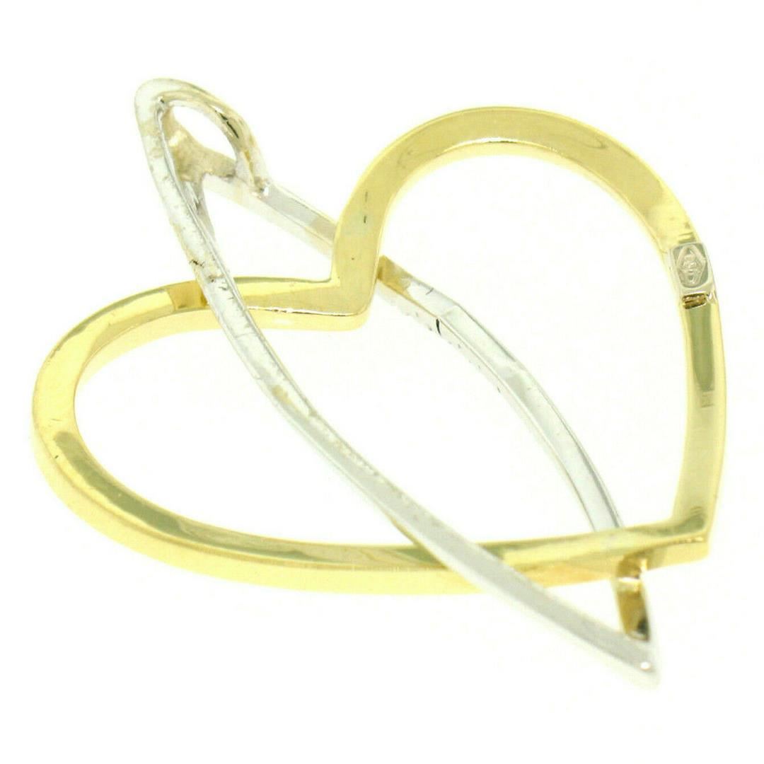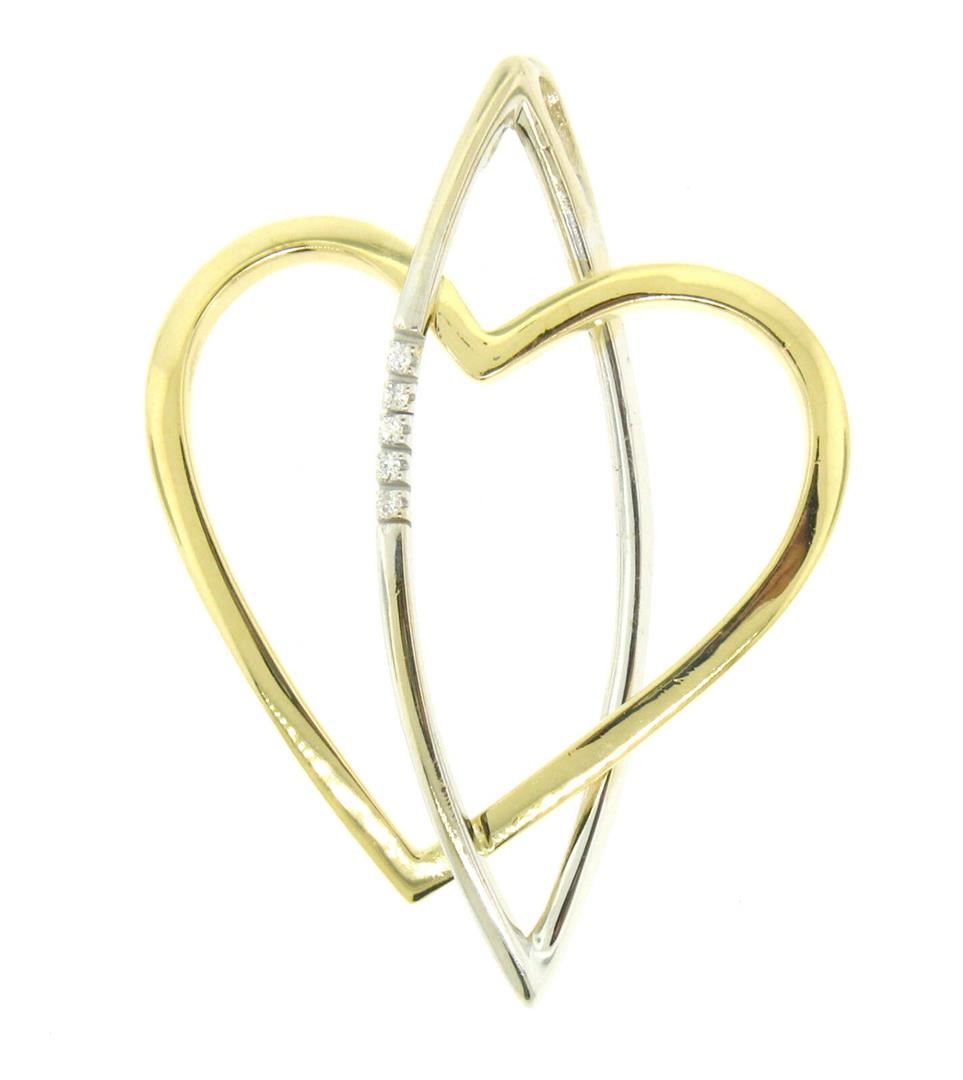 A like new 18kt gold pendant featuring a yellow gold open heart intertrwined with a white gold open marquise shape which is prong set with 0.05ctw of round diamonds (G - VS2). The pendant weighs a total of 6.1 grams and measures 40.72x30.16mm.