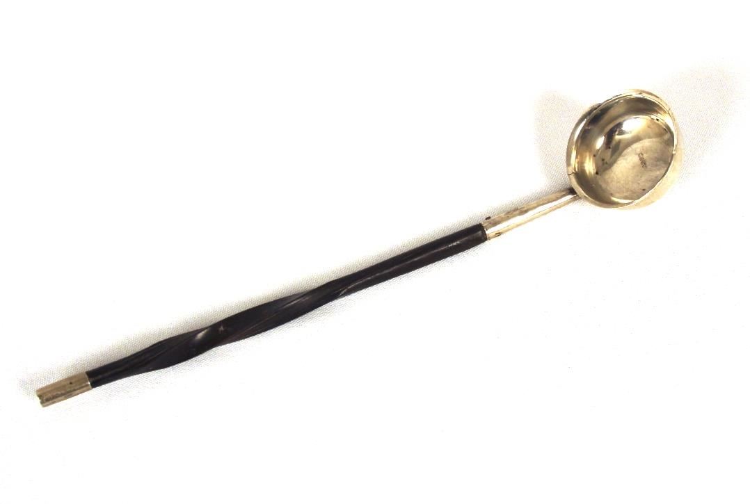 Presented is an old silver and baleen sauce or small toddy ladle made during the 1740s-1800. The ladle has a classical, twisted baleen handle with an elegant silver cap at the end. The bowl is round with a flared lip. The silver parts are guaranteed to be at least .900 silver or coin purity silver. This was certainly made in England or the United States. Although some English examples were unmarked, this is quite unusual. The lack of any hallmarks indicates that this piece is likely American. This ladle is in good overall condition for its age. There is a small crease/scratch in the top of the ladle lip near where the handle is attached. There are no flaws, no dents, no breaks, no monograms, no monogram removals and no repairs. The inside silver ladle is stamped AMD as well as the cap on the whale bone/baleen twisted handle. The ladle measures 8 inches long.