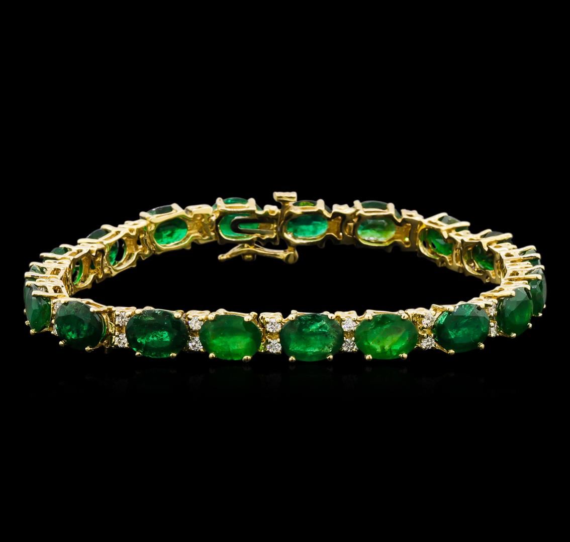 One electronically tested 14KT yellow gold lady's combination cast & assembled straight line bracelet with a tongue clasp & foldover safety with a bright polish finish. The featured lady's bracelet measures 7 inches in length. Identified with markings of "14K". Condition is new, good workmanship. Containing: Nineteen prong set oval modified brilliant cut natural emeralds, measuring 8.01 x 5.98 x 3.82mm, (depth est.) approximate total weight of 19.14ct., clarity is moderately included, medium dark, moderately strong, very slightly bluish green color, (GIA vslbG 6/4), cut is good. Transmitting light somewhat diffusely, transparent to translucent. Colored gemstones are presumed to have been subjected to commonly used enhancement processes. Indications of oil residue. Graded in the setting. Thirty-Eight prong set round brilliant cut diamonds, measuring 1.90 - 1.80 x 1.16mm (depth est.) approximate total weight of 38 Stones = 0.91ct. Graded in the setting. Clarity: VS-2 to SI-1. Color: H - I. Cut Very Good. Total Weight of Colored Stones 19.14ct. Total Weight of Diamonds 0.91ct. Total Weight of Bracelet 14.80gm. GAS Appraised at $10,600.00.