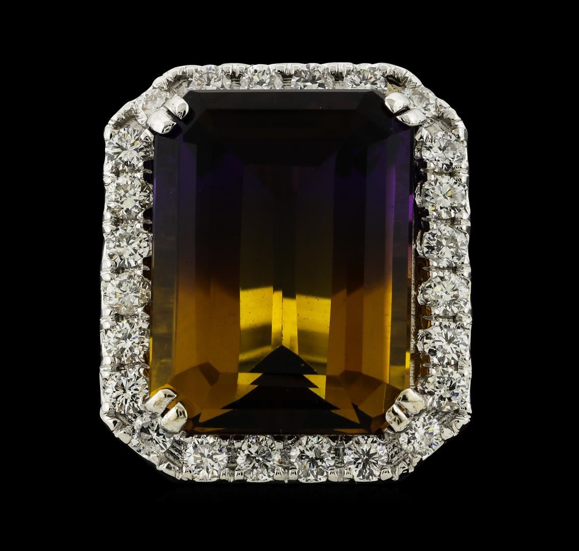 One electronically tested 14KT white gold lady's cast fashion ring with a cathedral cushion halo with a bright polish finish. The featured lady's ring has a shank measuring 3.65 millimeters wide. Identified with markings of '14K'. Condition is new, good workmanship. Containing: One prong set emerald standard step cut natural ametrine quartz, measuring 20.10 x 14.92 x 9.00mm, (depth est.) approximate weight of 19.23ct., clarity is eye clean, medium, moderately strong, purple color, (GIA P 5/4) to medium, moderately strong, orangy yellow, (GIA oY 5/4), cut is very good. Transmitting light with no distortion, transparent. Colored gemstones are presumed to have been subjected to commonly used enhancement processes. Graded in the setting. Twenty-Four prong set round brilliant cut diamonds, measuring 2.60 - 2.50 x 1.58mm (depth est.) approximate total weight of 24 Stones = 1.51ct. Graded in the setting. Clarity SI-1 to SI-2. Color: H - I Cut Good. Total Weight of Colored Stones 19.23ct.. Total Weight of Diamonds 1.51ct.. Total Weight of Ring 15.00gm. GAS Appraised.