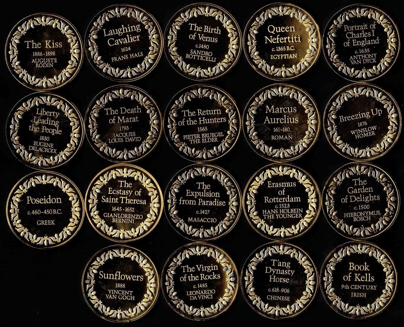 One (19) 24K Gold Plated Sterling Silver 2 oz Coins 100 Greatest Masterpieces. A total of 38 Ounces of .925 Sterling Silver Coins.