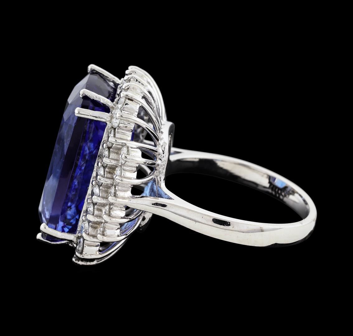 One electronically tested 14KT white gold lady's cast fashion ring with a cathedral shank with a basket halo with a bright polish finish. The featured lady's ring has a shank measuring 2.39 millimeters wide. Identified with markings of 'K14'. Condition is new, good workmanship. Containing: One prong set rectangular cushion modified brilliant cut natural tanzanite, measuring 18.54 x 13.60 x 8.35mm, (depth est.) 17%. bulge factor, approximate weight of 19.30ct., clarity is eye clean, medium, very slightly grayish, blue color, (GIA B 5/3), cut is very good. Transmitting light with no distortion, transparent. Colored gemstones are presumed to have been subjected to commonly used enhancement processes. Graded in the setting. Thirty-Six prong set round brilliant cut diamonds, measuring 2.20 - 2.10 x 1.33mm (depth est.) approximate total weight of 36 Stones = 1.35ct. Graded in the setting. Clarity SI-1 to I-1. Color: G - H Cut Good. Total Weight of Colored Stones 19.30ct.. Total Weight of Diamonds 1.35ct.. Total Weight of Ring 11.20gm. GAS Appraised at $24,730.00.