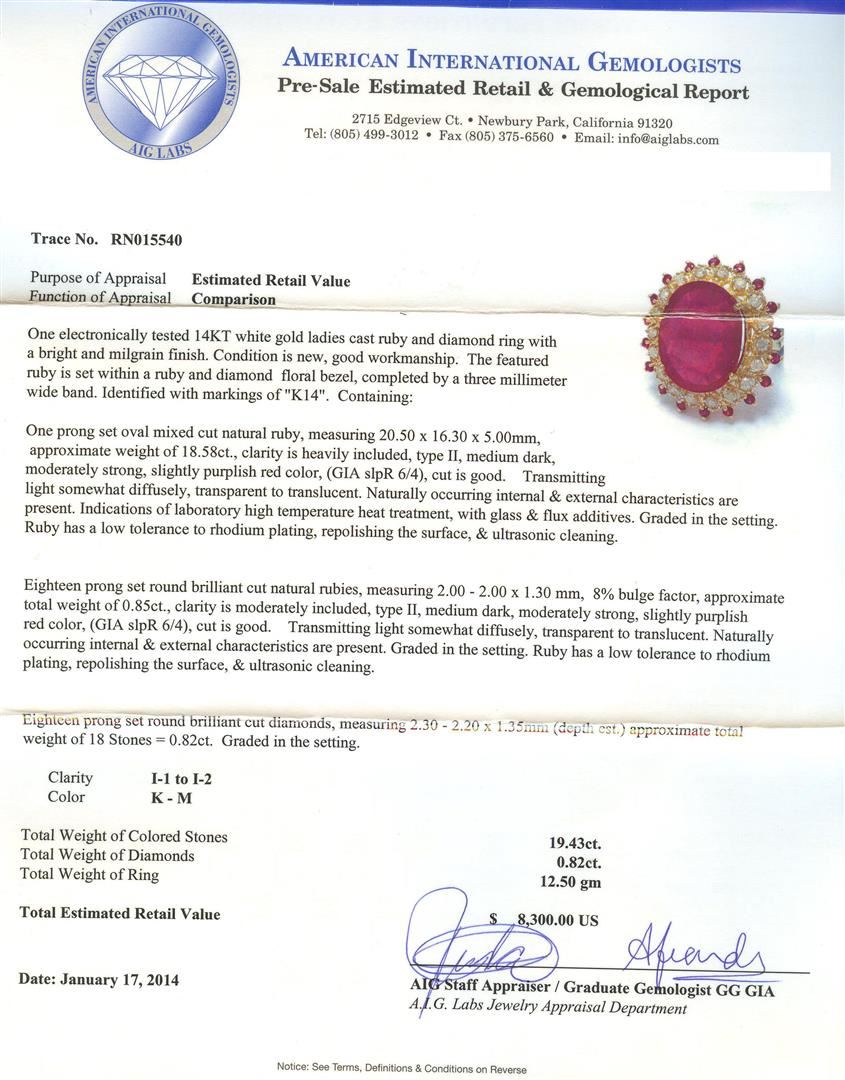 One electronically tested 14KT white gold ladies cast ruby and diamond ring with a bright and milgrain finish. The featured ruby is set within a ruby and diamond floral bezel, completed by a three millimeter wide band. Identified with markings of "K14". Condition is new, good workmanship. Containing: One prong set oval mixed cut natural ruby, measuring 20.50 x 16.30 x 5.00mm, approximate weight of 18.58ct., clarity is heavily included, type II, medium dark, moderately strong, slightly purplish red color, (GIA slpR 6/4), cut is good. Transmitting light somewhat diffusely, transparent to translucent. Naturally occurring internal & external characteristics are present. Indications of laboratory high temperature heat treatment, with glass & flux additives. Graded in the setting. Ruby has a low tolerance to rhodium plating, repolishing the surface, & ultrasonic cleaning. Eighteen prong set round brilliant cut natural rubies, measuring 2.00 - 2.00 x 1.30 mm, 8%. bulge factor, approximate total weight of 0.85ct., clarity is moderately included, type II, medium dark, moderately strong, slightly purplish red color, (GIA slpR 6/4), cut is good. Transmitting light somewhat diffusely, transparent to translucent. Naturally occurring internal & external characteristics are present. Graded in the setting. Ruby has a low tolerance to rhodium plating, repolishing the surface, & ultrasonic cleaning. Eighteen prong set round brilliant cut diamonds, measuring 2.30 - 2.20 x 1.35mm (depth est.) approximate total weight of 18 Stones = 0.82ct. Graded in the setting. Clarity: I-1 to I-2. Color: K - M. Total Weight of Colored Stones 19.43ct. Total Weight of Diamonds 0.82ct. AIG Appraised at $8,300.00.