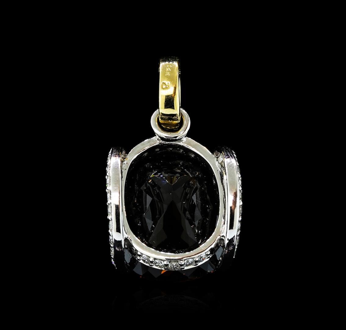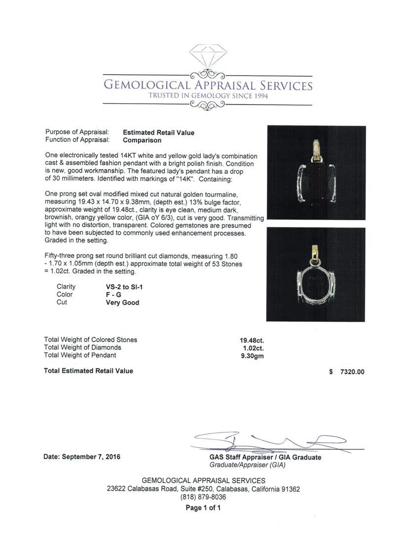 One electronically tested 14KT white and yellow gold lady's combination cast & assembled fashion pendant with a bright polish finish. The featured lady's pendant has a drop of 30 millimeters. Identified with markings of '14K'. Condition is new, good workmanship. Containing: One prong set oval modified mixed cut natural golden tourmaline, measuring 19.43 x 14.70 x 9.38mm, (depth est.) 13%. bulge factor, approximate weight of 19.48ct., clarity is eye clean, medium dark, brownish, orangy yellow color, (GIA oY 6/3), cut is very good. Transmitting light with no distortion, transparent. Colored gemstones are presumed to have been subjected to commonly used enhancement processes. Graded in the setting. Fifty-Three prong set round brilliant cut diamonds, measuring 1.80 - 1.70 x 1.05mm (depth est.) approximate total weight of 53 Stones = 1.02ct. Graded in the setting. Clarity VS-2 to SI-1. Color: F - G Cut Very Good. Total Weight of Colored Stones 19.48ct.. Total Weight of Diamonds 1.02ct.. Total Weight of Pendant 9.30gm GAS Appraised at $7,320.00.