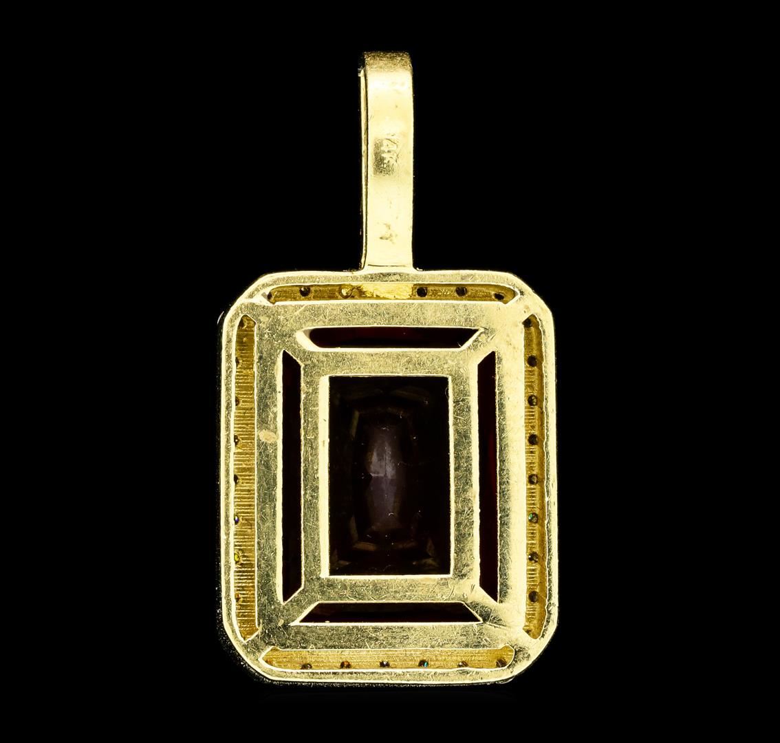 One electronically tested 14KT yellow gold lady's cast fashion pendant with a halo with a bright polish finish. Identified with markings of '14K'. Condition is used, good workmanship. Containing: One prong set radiant modified brilliant cut laboratory created ruby, measuring 17.15 x 13.15 x 8.31mm, (depth est.) approximate weight of 19.50ct., clarity is eye clean, medium dark, strong, red color, (GIA R 6/5), cut is very good. Transmitting light with no distortion, transparent. Colored gemstones are presumed to have been subjected to commonly used enhancement processes. Graded in the setting. Thirty-Six prong set round brilliant cut diamonds, measuring 1.80 - 1.70 x 1.09mm (depth est.) approximate total weight of 36 Stones = 0.75ct. Graded in the setting. Clarity SI-1 to I-1. Color: G - H Cut Good. Total Weight of Colored Stones 19.50ct.. Total Weight of Diamonds 0.75ct.. Total Weight of Pendant 11.20gm GAS Appraised at $2,545.00.