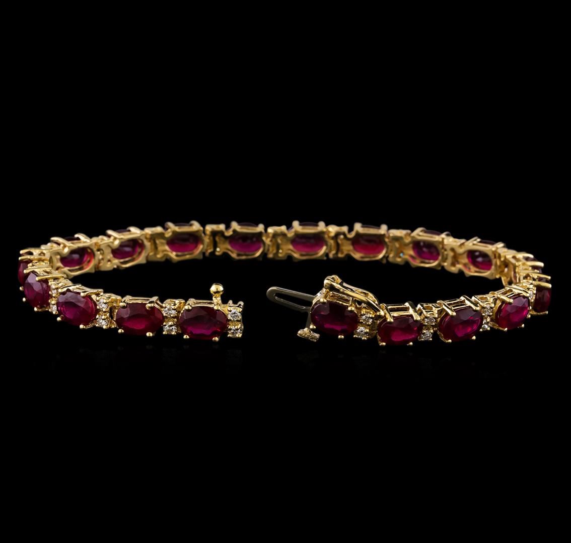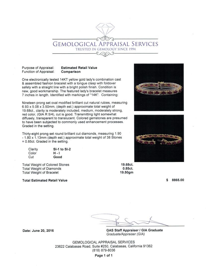 One electronically tested 14KT yellow gold lady's combination cast & assembled fashion bracelet with a tongue clasp with foldover safety with a straight line with a bright polish finish. The featured lady's bracelet measures 7 inches in length. Identified with markings of "14K". Condition is new, good workmanship. Containing: Nineteen prong set oval modified brilliant cut natural rubies, measuring 6.93 x 5.08 x 3.50mm, (depth est.) approximate total weight of 19.68ct., clarity is moderately included, medium, moderately strong, red color, (GIA R 5/4), cut is good. Transmitting light somewhat diffusely, transparent to translucent. Colored gemstones are presumed to have been subjected to commonly used enhancement processes. Graded in the setting. Thirty-Eight prong set round brilliant cut diamonds, measuring 1.90 - 1.80 x 1.13mm (depth est.) approximate total weight of 38 Stones = 0.85ct. Graded in the setting. Clarity: SI-1 to SI-2. Color: H - I. Cut Good. Total Weight of Colored Stones 19.68ct. Total Weight of Diamonds 0.85ct. Total Weight of Bracelet 19.50gm. GAS Appraised at $8,865.00.