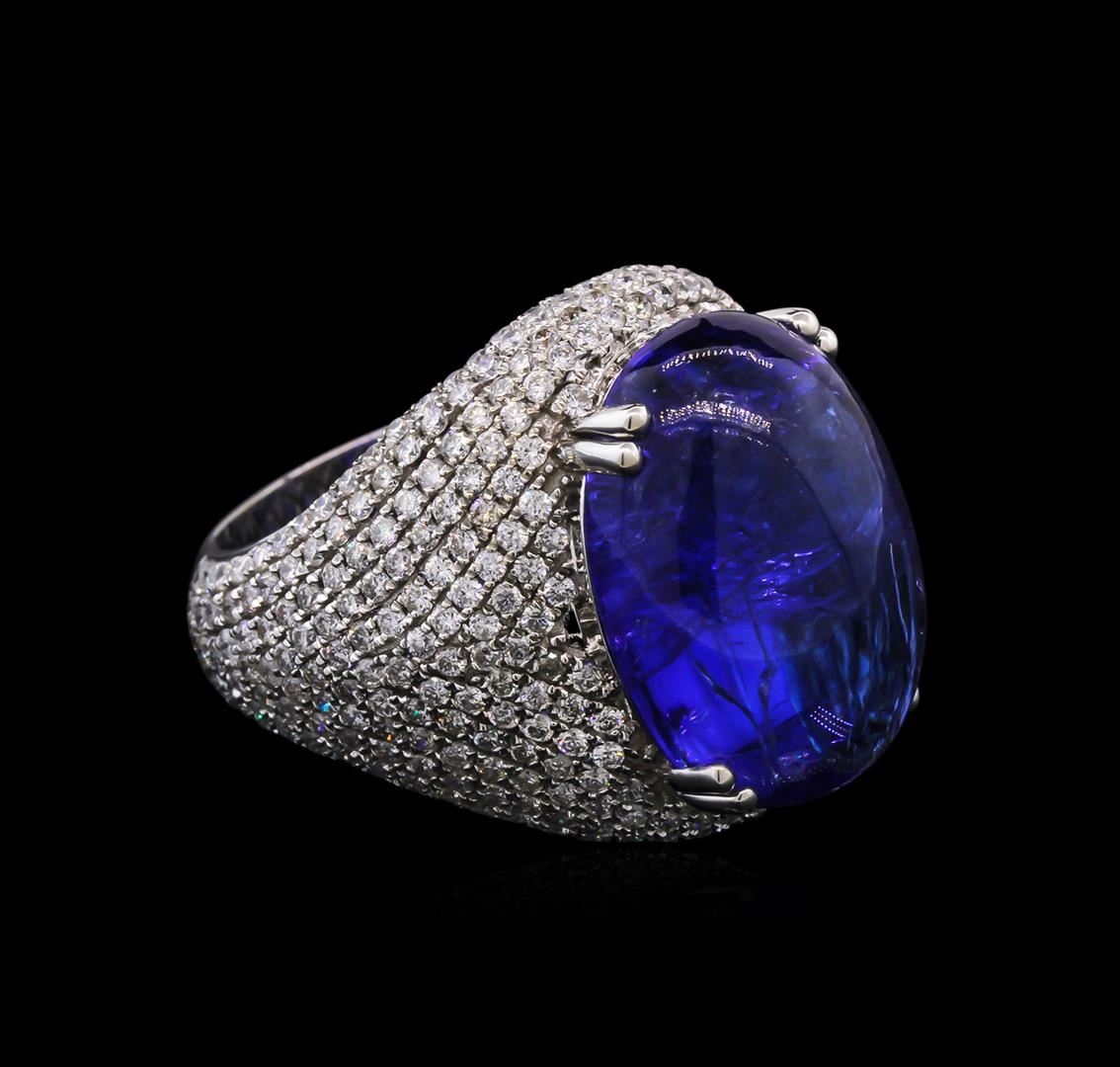 One ring featuring: 14KT white gold weighing 10.25 grams containing one tanzanite with a total weight of 19.70ct and diamonds with a total weight of 2.97ct.