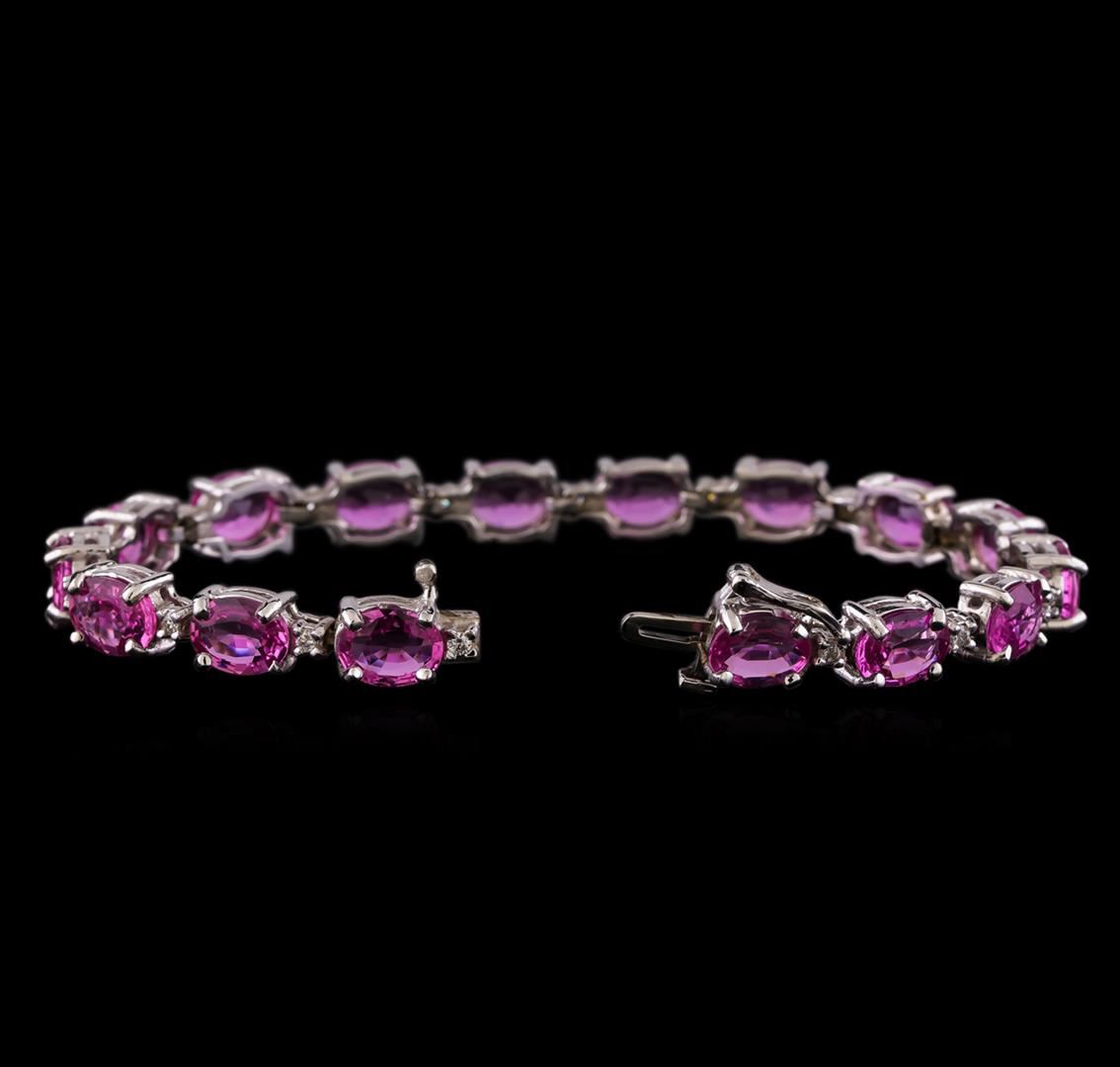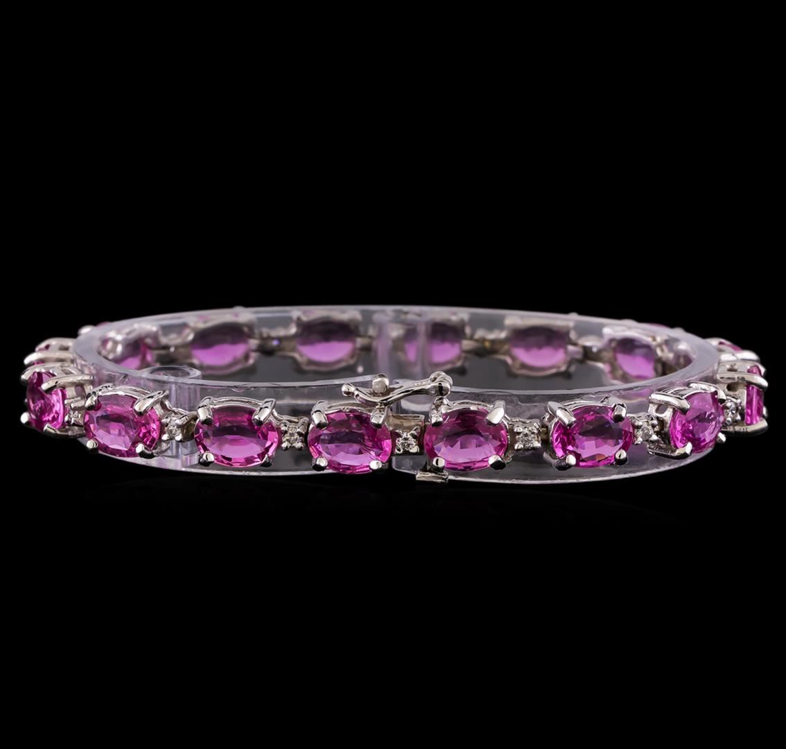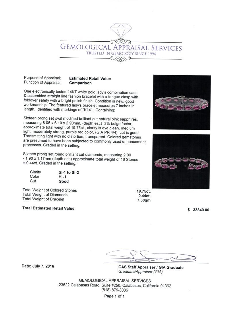 One electronically tested 14KT white gold lady's combination cast & assembled straight line fashion bracelet with a tongue clasp with fold over safety with a bright polish finish. The featured lady's bracelet measures 7 inches in length. Identified with markings of "K14". Condition is new, good workmanship. Containing: Sixteen prong set oval modified brilliant cut natural pink sapphires, measuring 8.05 x 6.10 x 2.90mm, (depth est.) 3%. bulge factor, approximate total weight of 19.75ct., clarity is eye clean, medium light, moderately strong, purple red color, (GIA PR 4/4), cut is good. Transmitting light with no distortion, transparent. Colored gemstones are presumed to have been subjected to commonly used enhancement processes. Graded in the setting. Sixteen prong set round brilliant cut diamonds, measuring 2.00 - 1.90 x 1.17mm (depth est.) approximate total weight of 16 Stones = 0.44ct. Graded in the setting. Clarity: SI-1 to SI-2. Color: H - I. Cut Good. Total Weight of Colored Stones 19.75ct. Total Weight of Diamonds 0.44ct. Total Weight of Bracelet 7.60gm. GAS Appraised at $33,840.00.