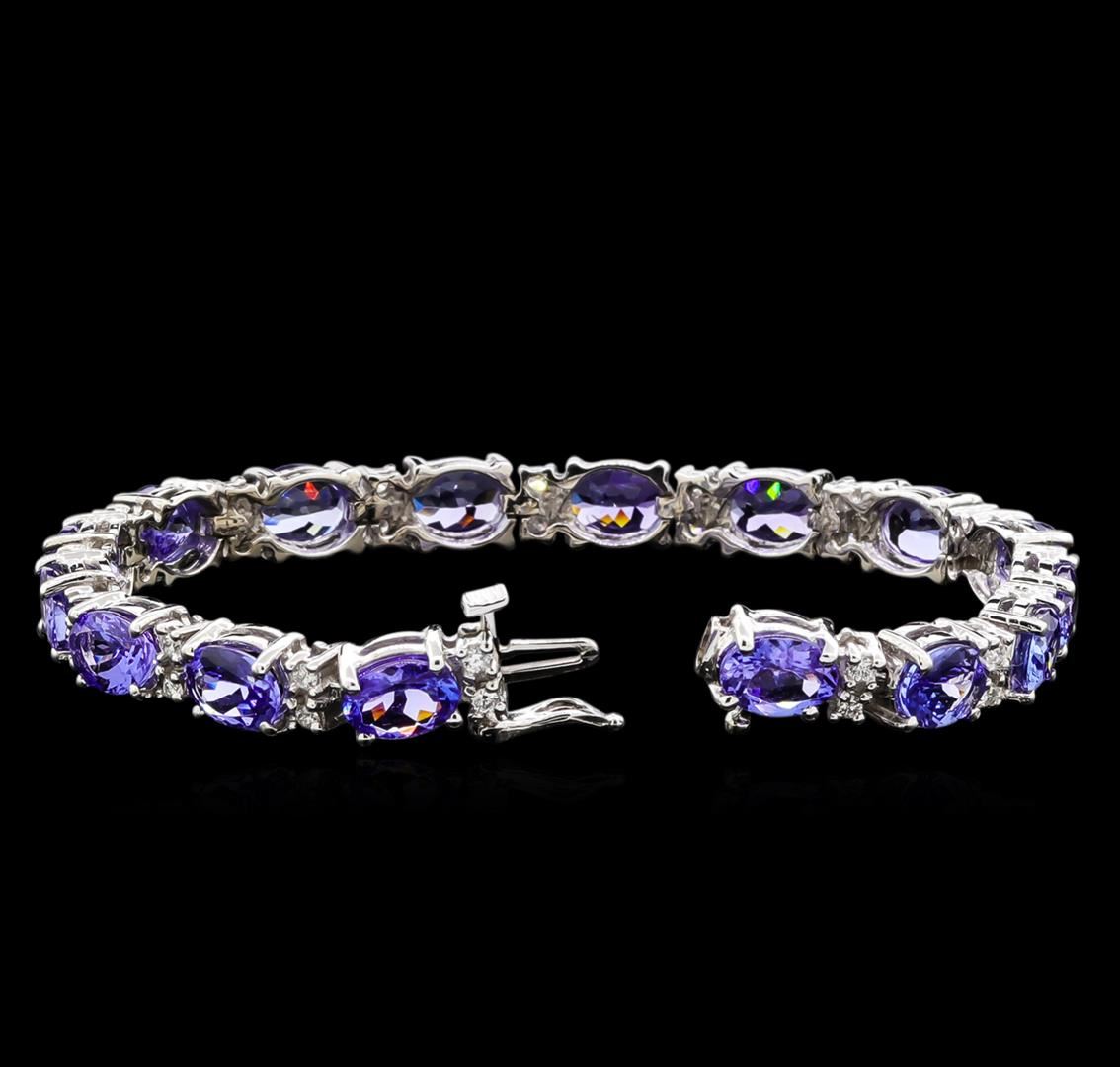 One electronically tested 14KT white gold lady's combination cast & assembled fashion bracelet with a tongue clasp with foldover safety with a bright polish finish. The featured lady's bracelet measures 7 inches in length. Identified with markings of "14K". Condition is new, good workmanship. Containing: Sixteen prong set oval modified brilliant cut natural tanzanites, measuring 8.00 x 5.80 x 3.80mm, approximate total weight of 19.90ct., clarity is eye clean, type I, medium, very slightly grayish, bluish violet color, (GIA bV 5/3), cut is good. Transmitting light with no distortion, transparent. Colored gemstones are presumed to have been subjected to commonly used enhancement processes. Graded in the setting. Thirty-Two prong set round brilliant cut diamonds, measuring 1.90 - 1.80 x 1.17mm (depth est.) approximate total weight of 32 Stones = 0.78ct. Graded in the setting. Clarity: SI-1 to SI-2. Color: H - I. Cut Very Good. Total Weight of Colored Stones 19.90ct. Total Weight of Diamonds 0.78ct. Total Weight of Bracelet 20.60gm. GAS Appraised at $22,530.00.