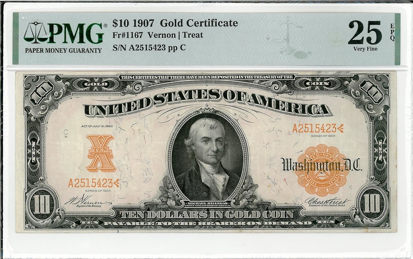 One 1907 $10 Gold Certificate Bank Note PMG 25 Very Fine EPQ. The serial number is 2515423.