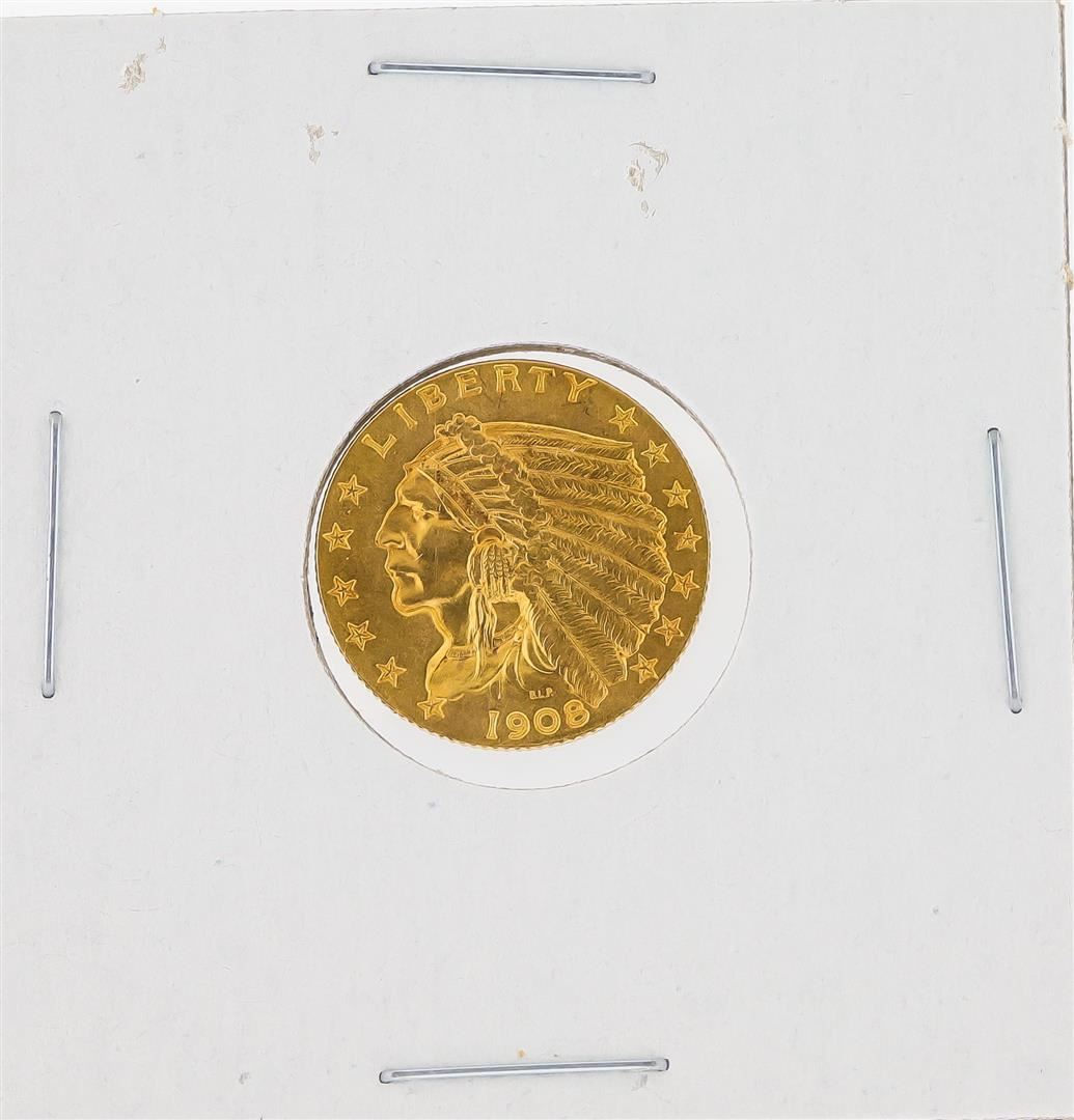 One 1908 $2.50 AU Indian Head Quarter Eagle Gold Coin.