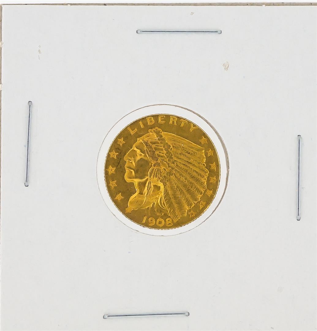 One 1908 $2.50 BU Indian Head Quarter Eagle Gold Coin.