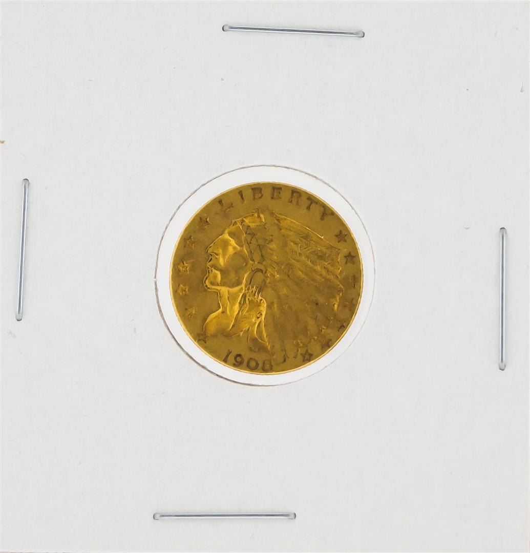 One 1908 $2.50 VF Indian Head Quarter Eagle Gold Coin.