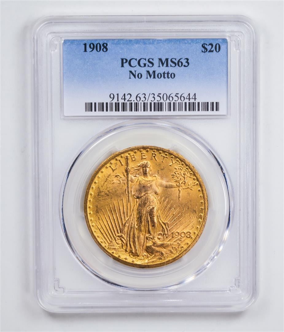 One 1908 $20 No Motto Double Eagle Gold Coin PCGS MS63.