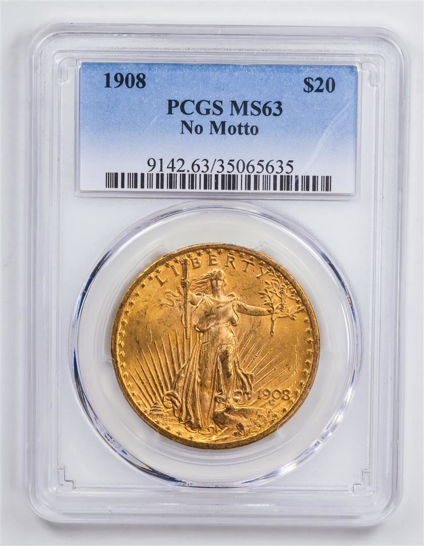 One 1908 $20 No Motto Double Eagle Gold Coin PCGS MS63.