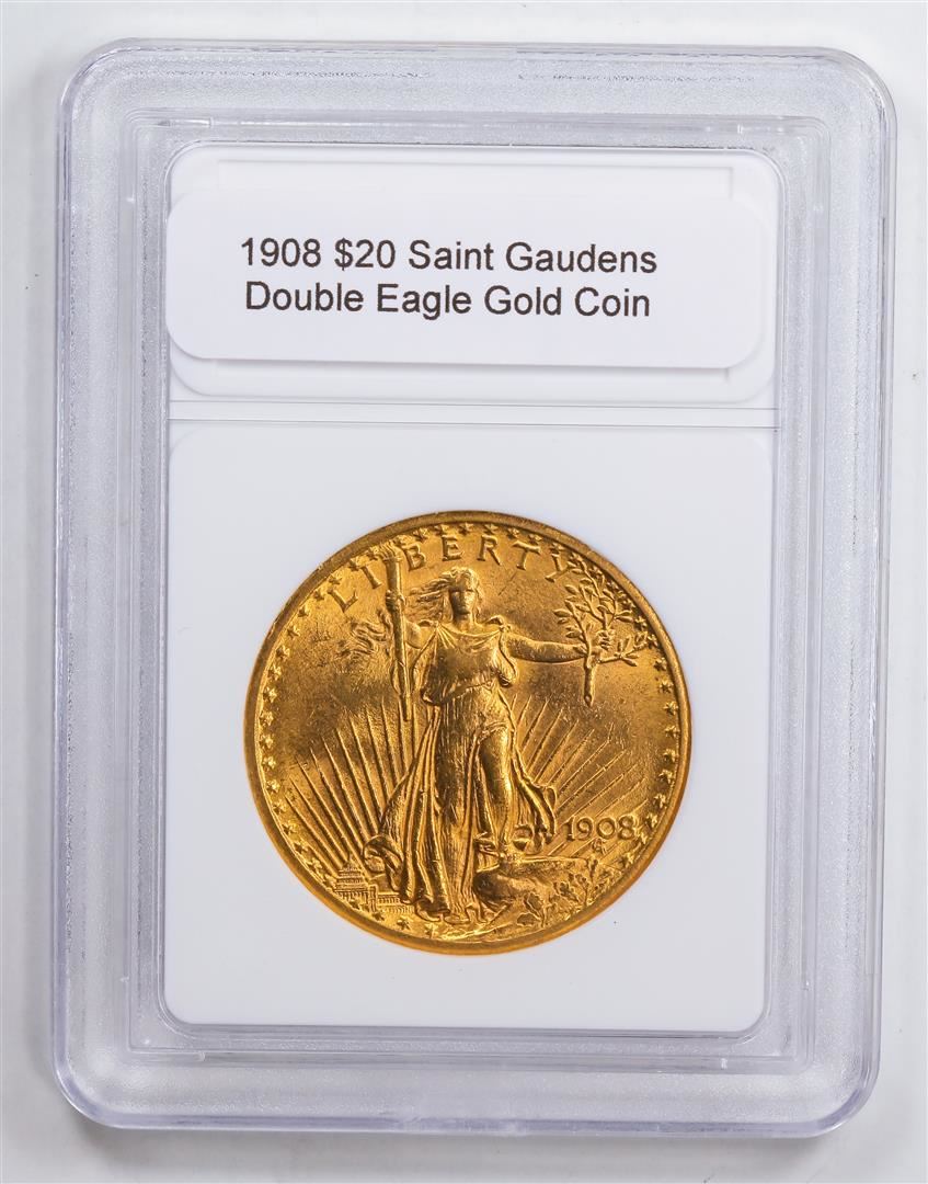 One 1908 $20 Saint Gaudens Double Eagle Gold Coin.
