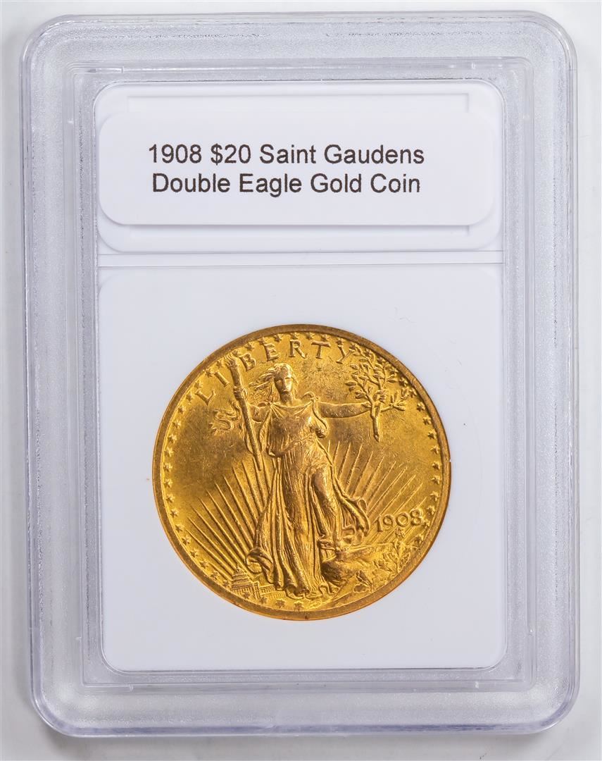 One 1908 $20 Saint Gaudens Double Eagle Gold Coin.