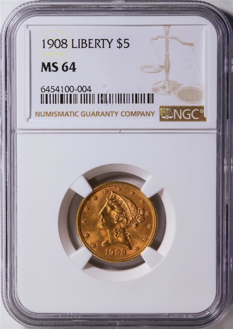 One 1908 $5 Liberty Head Half Eagle Gold Coin NGC MS64.