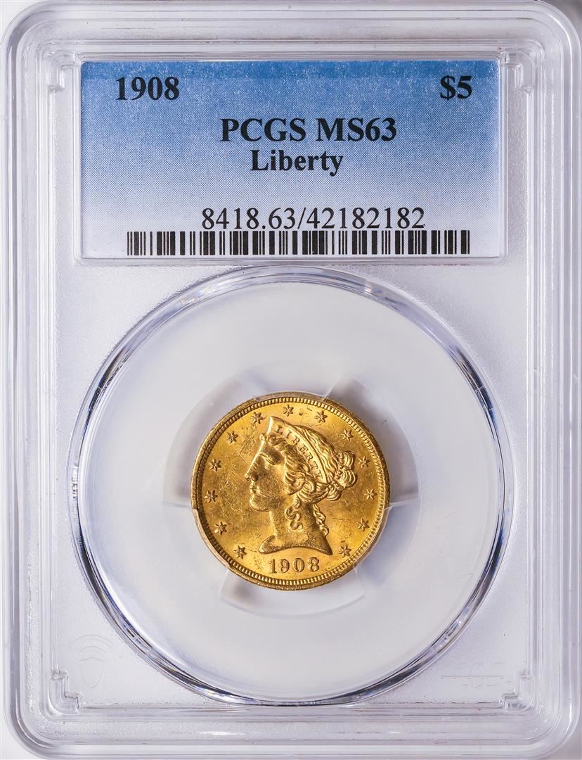 One 1908 $5 Liberty Head Half Eagle Gold Coin PCGS MS63.