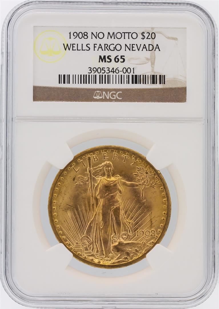 One 1908 NGC MS65 $20 St. Gaudens Double Eagle Wells Fargo Nevada Gold Coin. NGC Certified.