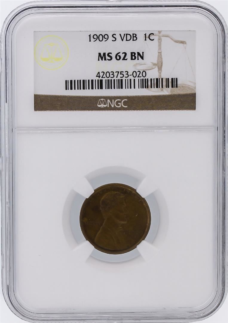 One 1909-S VDB Penny Lincoln Wheat Cent NGC Graded MS62 BN. NGC Certified.