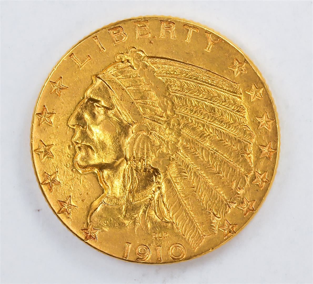 One 1910 $5 Indian Head Half Eagle Gold Coin CU.