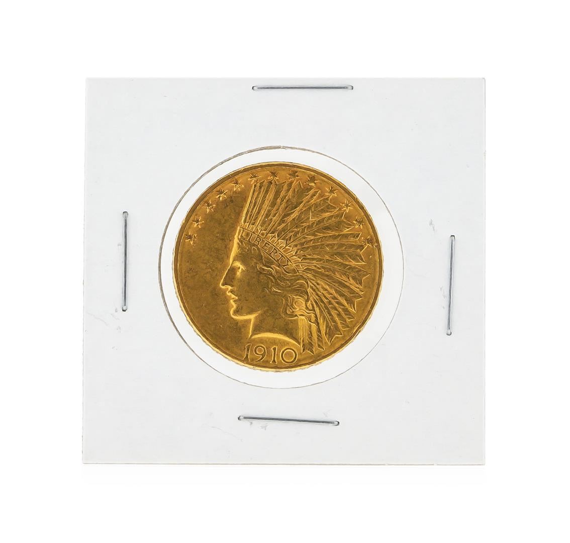 One 1910-D $10 AU Indian Head Eagle Gold Coin.
