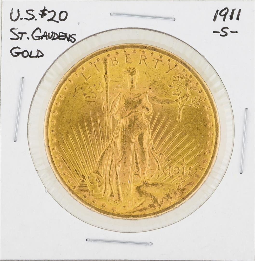 One 1911-S $20 St. Gaudens Double Eagle Gold Coin.