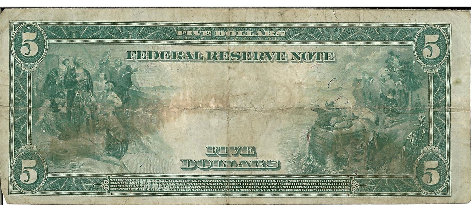 One 1914 $5 Federal Reserve Bank Note. The serial number is 21349015.