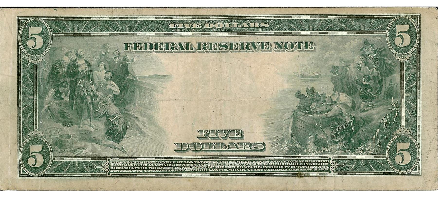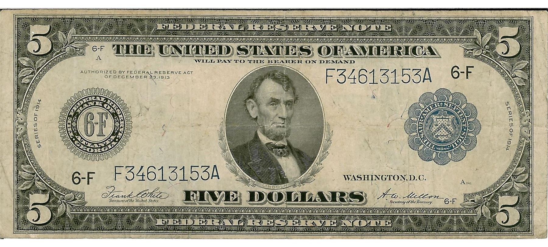 One 1914 $5 Federal Reserve Bank Note. The serial number is 34613153.