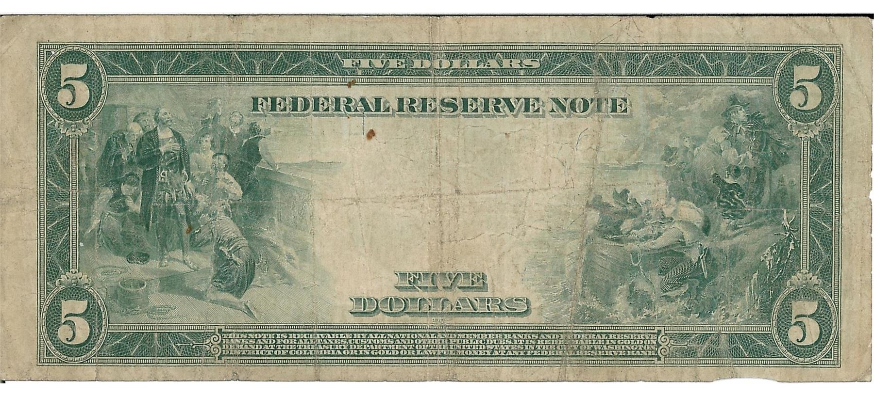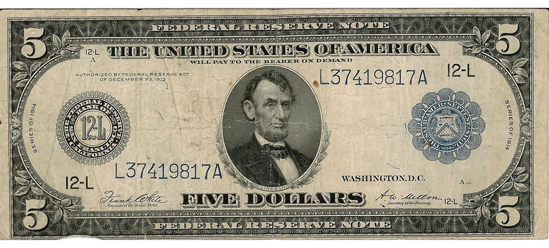 One 1914 $5 Federal Reserve Bank Note. The serial number is 37419817.