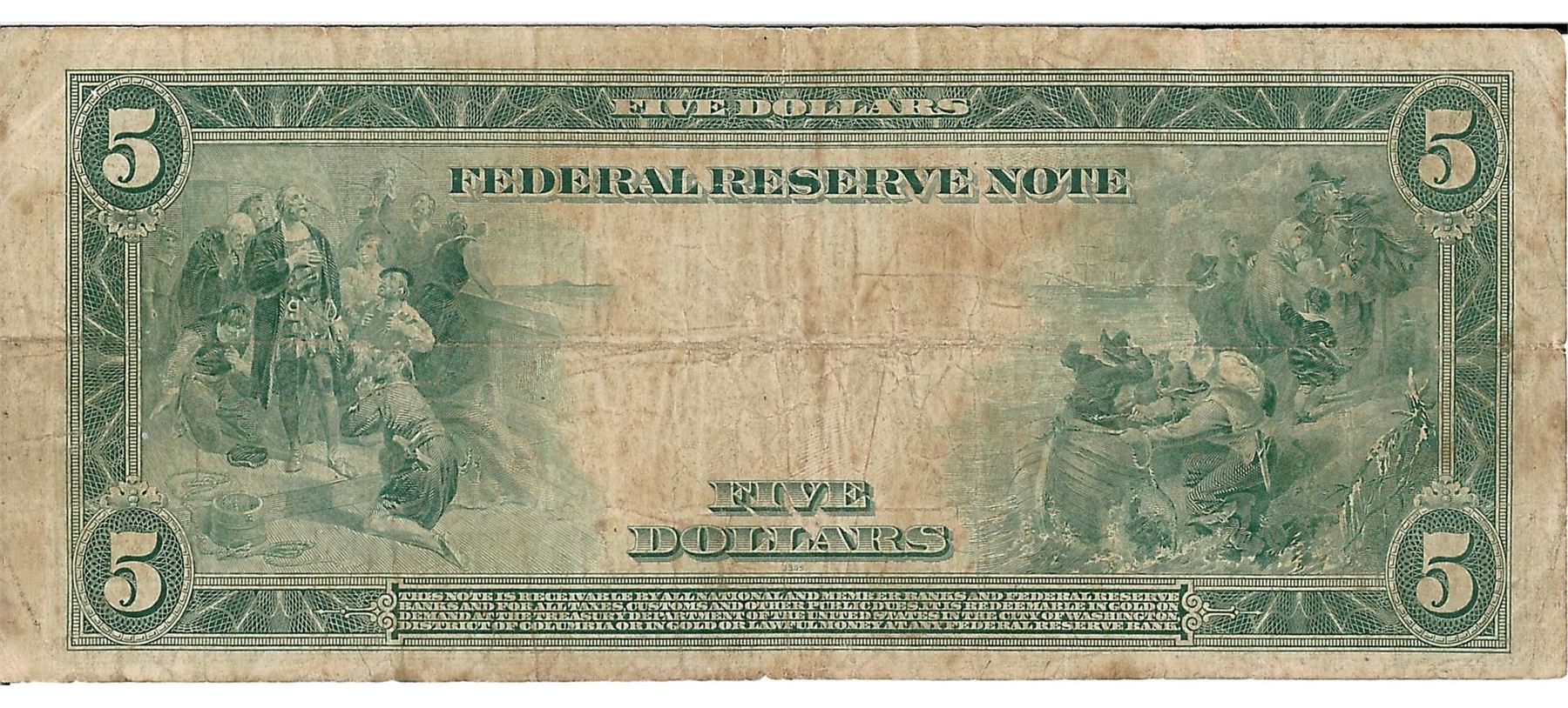 One 1914 $5 Federal Reserve Bank Note. The serial number is 44887640.
