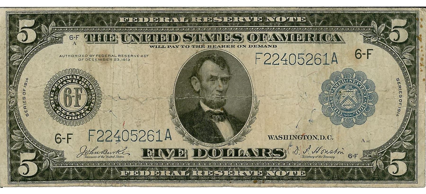 One 1914 $5 Federal Reserve Bank Note. The serial number is 22405261.