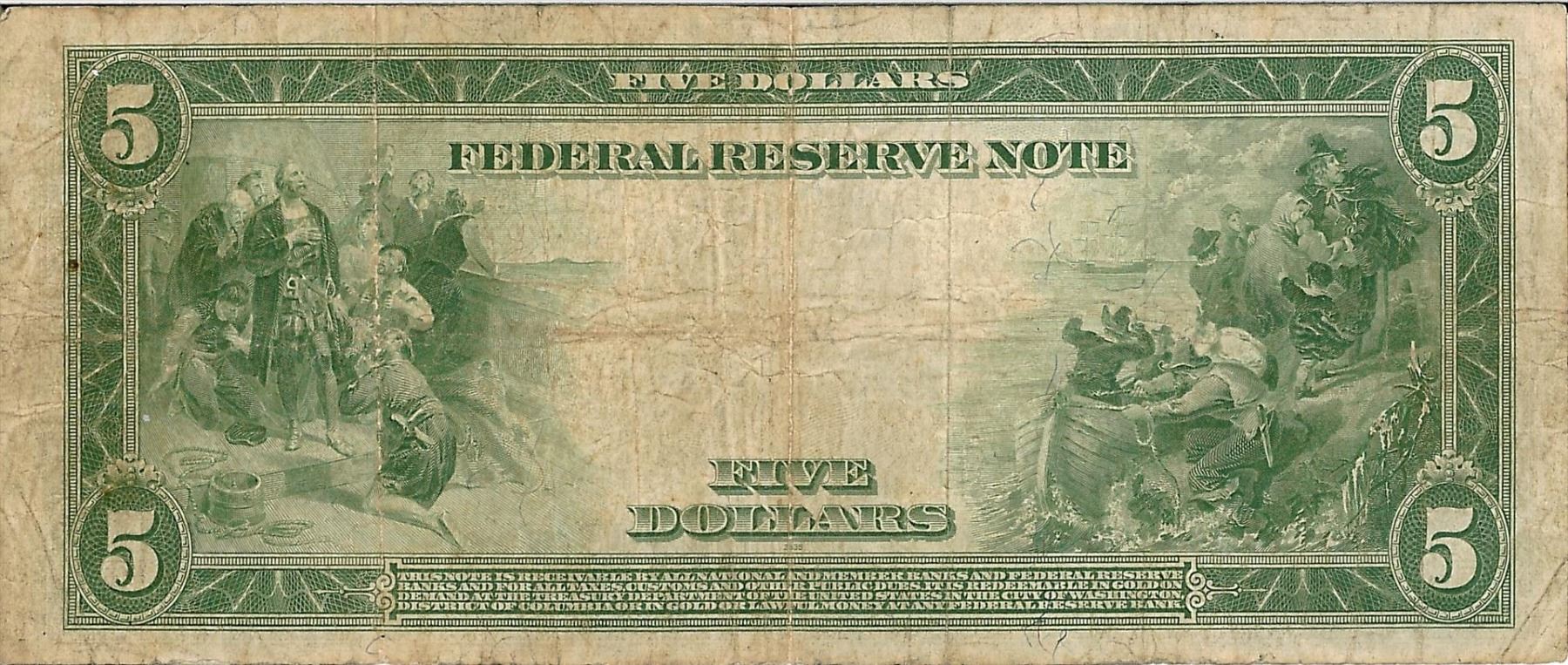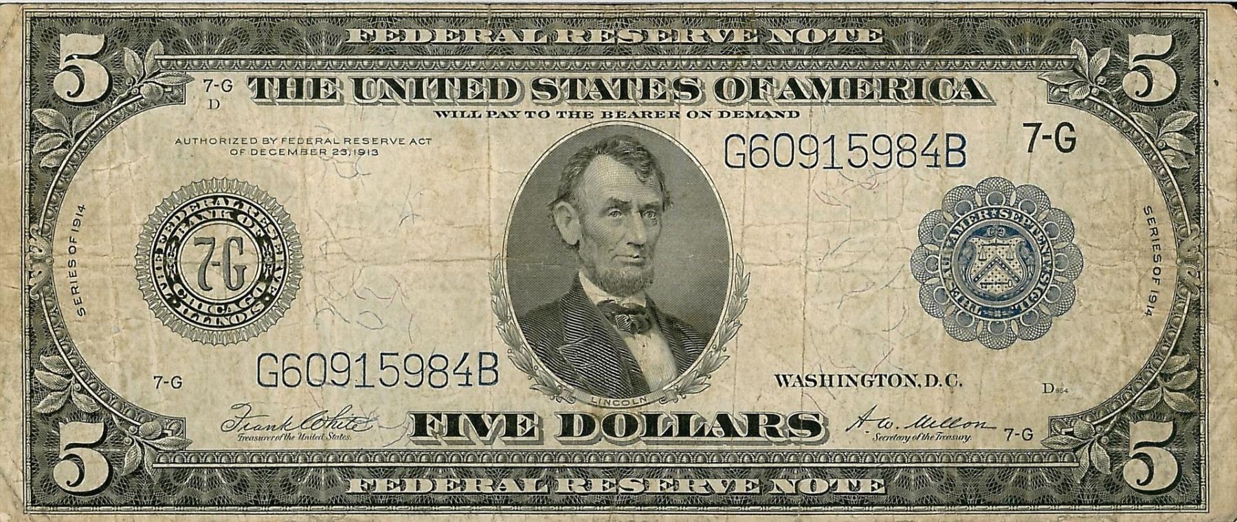 One 1914 $5 Federal Reserve Bank Note. The serial number is 60915984.