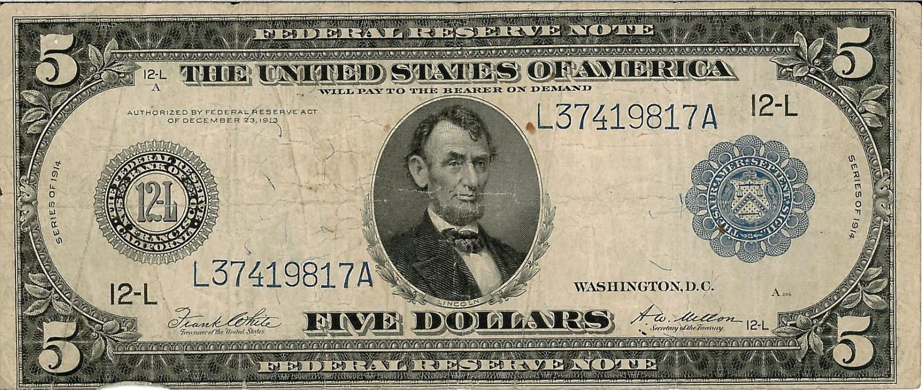One 1914 $5 Federal Reserve Bank Note. The serial number is 37419817.