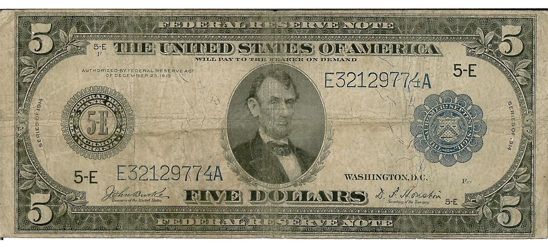 One 1914 $5 Federal Reserve Bank Note. The serial number is 32129774.