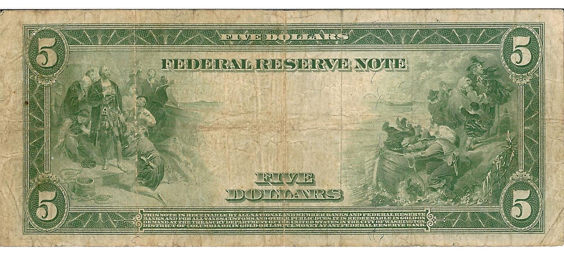 One 1914 $5 Federal Reserve Bank Note. The serial number is 60915984.