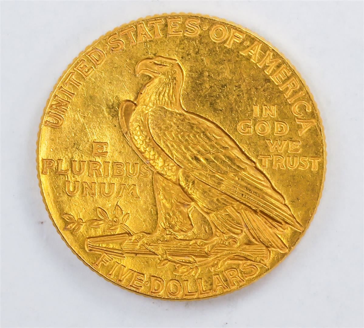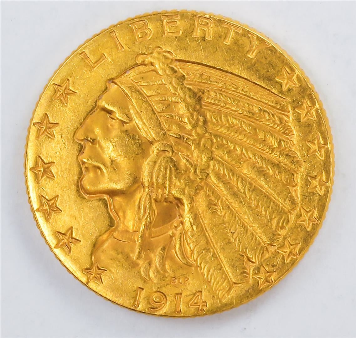 One 1914 $5 Indian Head Half Eagle Gold Coin XF.