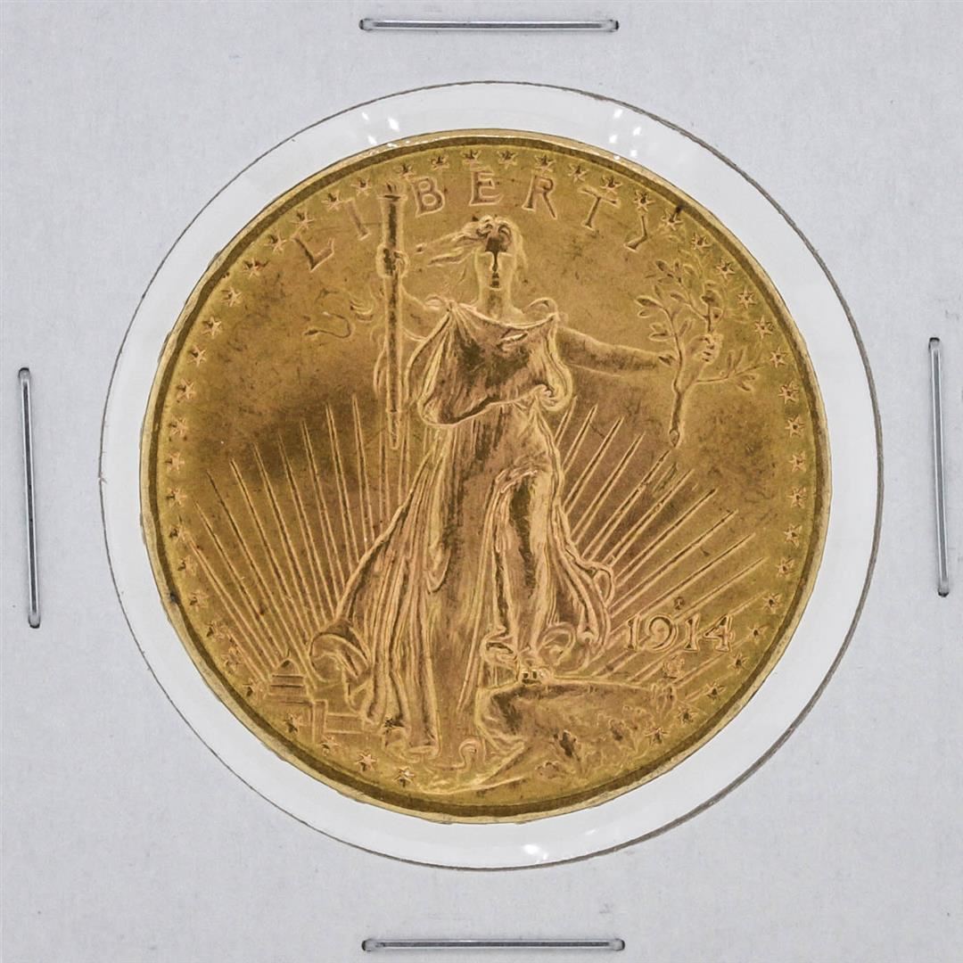 One 1914-D $20 BU St. Gaudens Double Eagle Coin.