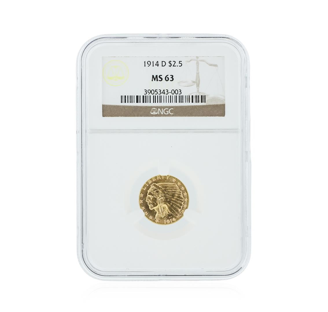 One 1914-D NGC MS63 $2.50 Indian Head Quarter Eagle Gold Coin. NGC Certified.
