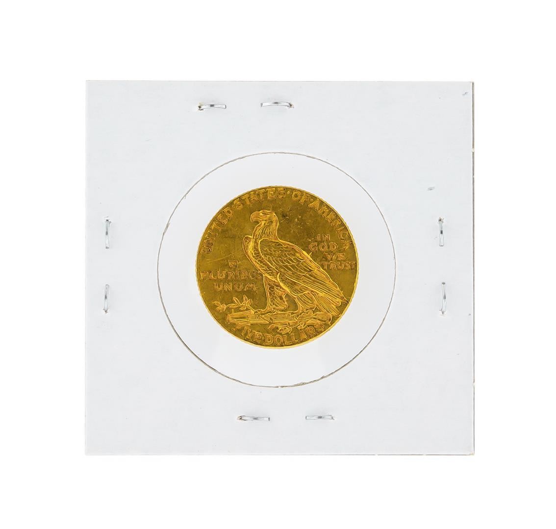 One 1915 $5 AU Indian Head Half Eagle Gold Coin.